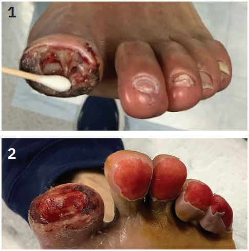 A 68-year-old male presented with critical limb ischemia involving the left toes. Over several weeks, the wound worsened, spreading to adjacent toes. Debridement was performed by a podiatrist, who advised bone resection and potential vascular intervention to support healing (Figures 1-2).