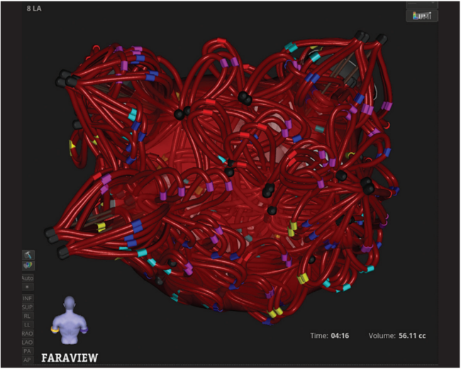 Use of 4D ICE enables real-time visualization of the left atrium (LA) and LAA, eliminating the need for transesophageal echocardiography (TEE). The spatial resolution and volumetric imaging provided by 4D ICE facilitate both phases of the combined procedure by confirming catheter contact during PFA and guiding accurate device deployment during LAAO. Integration with electroanatomical mapping allows for detailed reconstruction of the LA and PVs, supporting precise lesion delivery and confirmation of durable isolation during PFA.